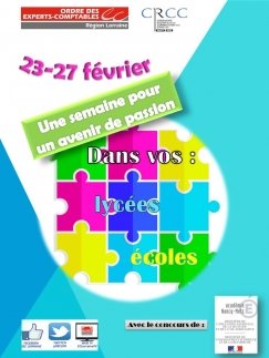 Les métiers de l'expertise comptable sont méconnus malgré les grandes possibilités qu'ils offrent en termes de diversité de mode d'exercice, de public rencontré (professions libérales, PME-PMI, artisans-commerçants, multinationales, secteur associatif) et de postes à occuper. Le secteur de l'expertise comptable est un secteur qui recrute, et le conseil régional de l'Ordre des experts-comptables de Lorraine souhaite le faire savoir !Avec le concours du rectorat de l'Académie Nancy-Metz, les experts-comptables sont allés, cette année encore, à la rencontre de 2 500 élèves dans les établissements de la région. Ils ont présenté de manière ludique et moderne la profession comptable (vidéos, diaporama...) et ont échangé avec les jeunes pour faire découvrir ou mieux faire connaître leur métier. RENCONTRE EXCEPTIONNELLE LE 26 FEVRIER AU CENTRE DES CONGRES D'EPINAL Dans le cadre de cette opération, une rencontre a eu lieu au Centre des Congrès d'Epinal, pour tous les lycéens et étudiants du secteur. Au programme : accueil à partir de 10h00, présentation de la Profession à 10h30, échanges avec les professionnels autour d'un cocktail à 12h00.